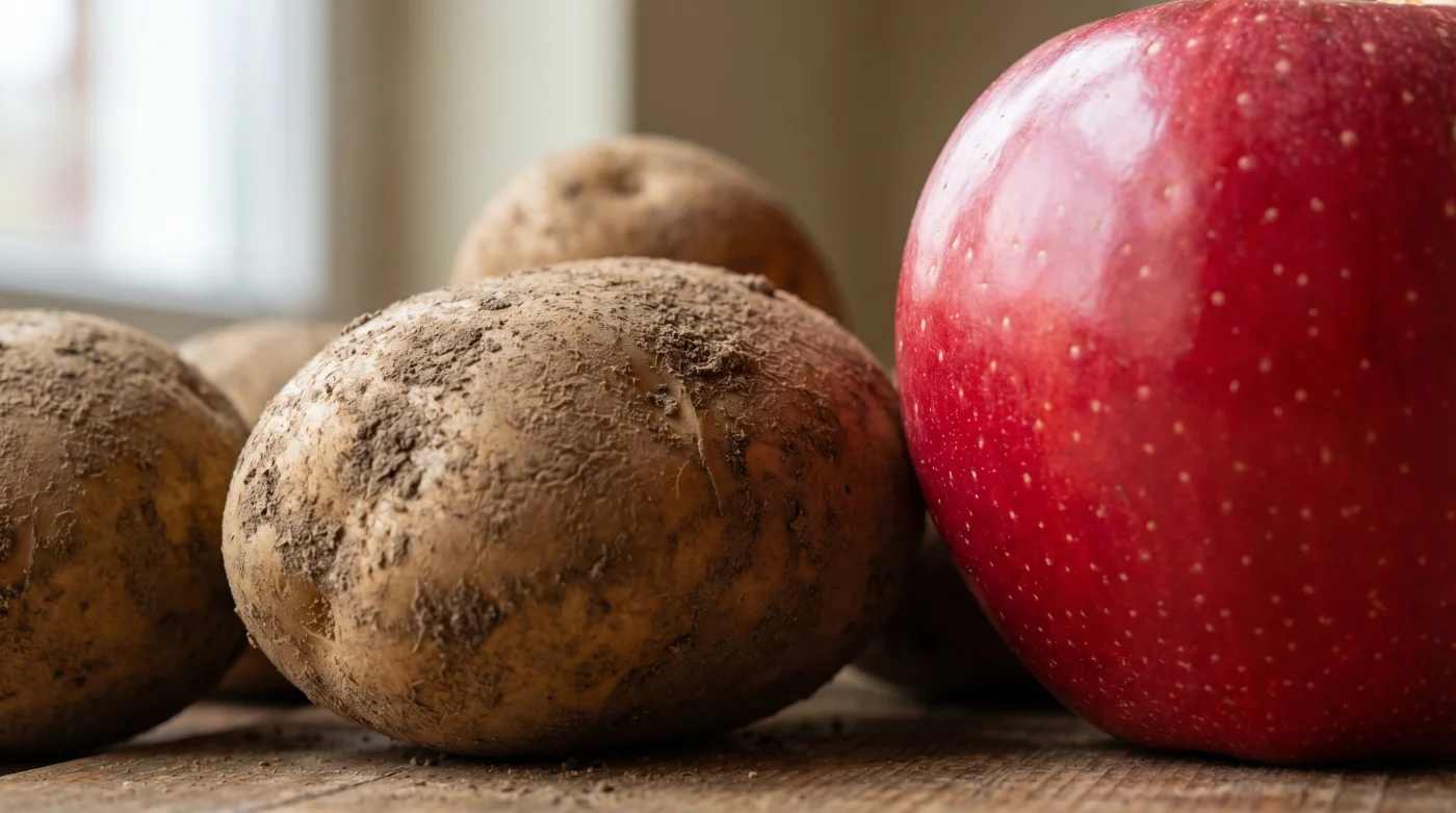 Tricket, den lilla modifikationen som dubblar råvarans livslängd, handlar om att bryta den biologiska klockan. Genom att lägga ett helt vanligt äpple bland knölarna introducerar du etylengas i ekvationen. För många andra frukter och grönsaker fungerar etylen som en gaspedal mot övermognad och röta, men för dessa jordiga rotfrukter fungerar det paradoxalt nog tvärtom. Äpplet agerar som ett milt sömnmedel, en kemisk vaggsång som dämpar celldelningen. Det är en fysiologisk kortslutning som stoppar mjuka och tråkiga groddar innan de ens hinner tänka tanken att vakna till liv.
