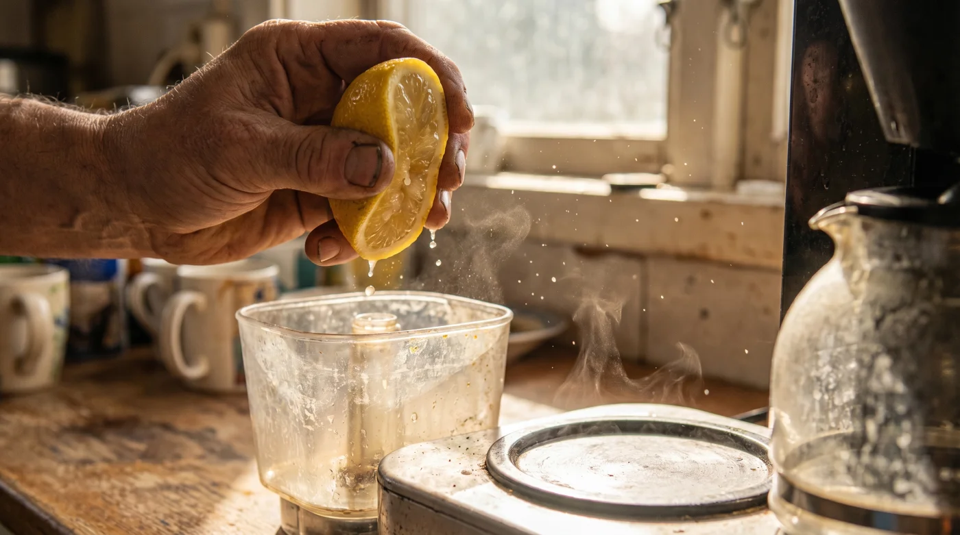 När tiden är en bristvara och kaffet ofta står på värmning i timmar byggs oljorna upp betydligt snabbare. Du kanske glömmer sumpen kvar i filtret över natten på grund av trötthet. För dig är detta en ren akutinsats som kräver noll skrubbande. Pressa en hel citron i vattenbehållaren medan du förbereder barnens frukost, starta bryggaren och låt maskinen sköta sig själv medan du gör annat.