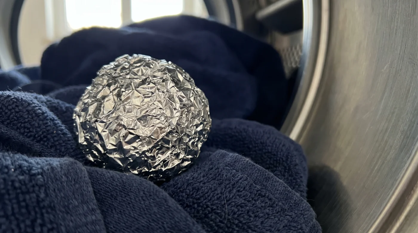 Riv av ungefär tre decimeter vanlig, silverglänsande hushållsfolie från rullen. Krama ihop den hårt i din hand. Målet är inte att skapa en perfekt och slät yta, utan snarare exakt tvärtom. Den ojämna ytan maximerar kontakten med både vattnet och dina kläder under rotationen, vilket dramatiskt ökar effektiviteten.