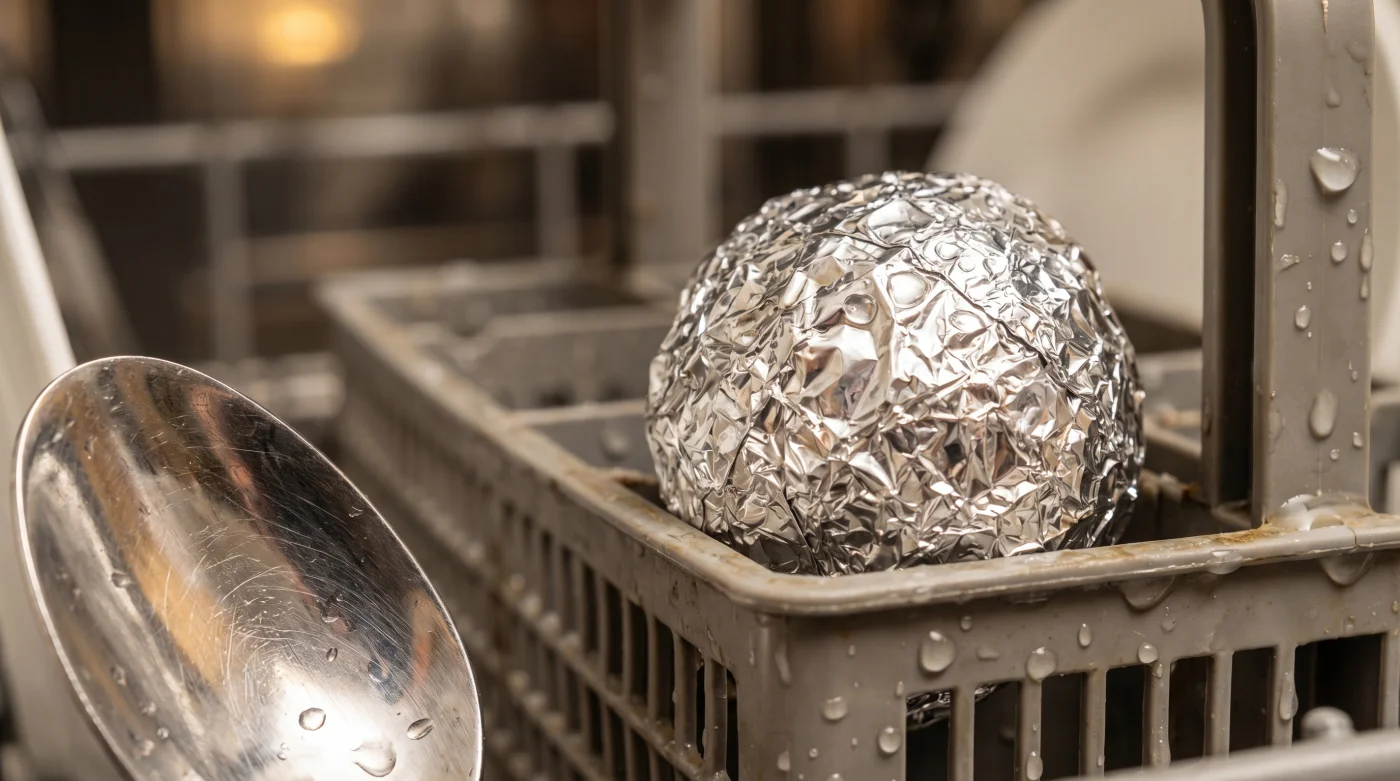 Det är här magin uppstår. Genom att introducera en boll av aluminiumfolie i diskmaskinen skapar du ett galvaniskt element. Tillsammans med det varma vattnet och de salter som finns i diskmedlet uppstår en svag, helt ofarlig elektrisk spänning. Folien blir en offeranod som drar till sig den mörka svavelföreningen från dina bestick. Det är som att metallen andas ut sin matthet i vattnet.