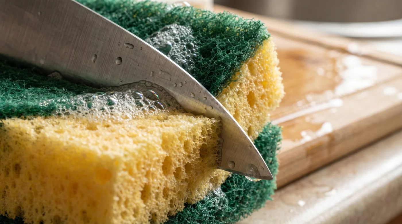 Kapillärkraften i en tjock polyuretansvamp drar kemikalierna rakt in i mitten, bort från stekpannan. Genom att halvera svampens volym förändrar du omedelbart fysiken i ditt arbete. Du eliminerar det döda utrymmet i mitten och tvingar diskmedlet att stanna på ytan. Såpan har ingenstans att fly, vilket betyder att varje enskild droppe hamnar exakt där den ska. Det är ett brutalt enkelt grepp som helt förändrar dynamiken och halverar åtgången av ditt diskmedel från dag ett.