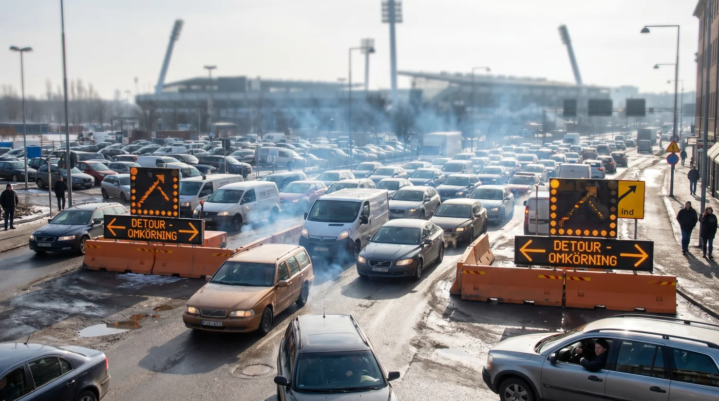 Men kilometer bort från de vita strålkastarna byggs en helt annan sorts spänning upp. Röda baklyktor sträcker sig som ett stillastående pärlband längs Stadiongatan. Du förväntar dig kanske den vanliga hemresan från jobbet, men verkligheten ikväll är en tillfällig infrastrukturell hjärtinfarkt som kräver din fulla uppmärksamhet.