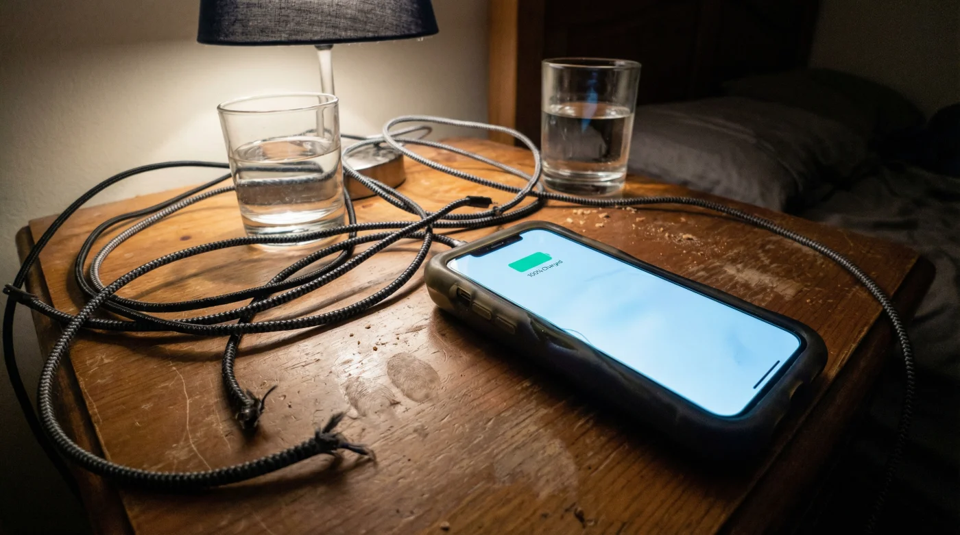 Rummet är tyst, förutom det dova ljudet av regn mot fönsterblecket. Du trycker in laddsladden i botten av telefonen, hör det bekanta lilla klicket och ser skärmen lysa upp med ett tryggt grönt batteri. Klockan är strax efter elva på kvällen, och morgondagens larm är ställt för längesedan.