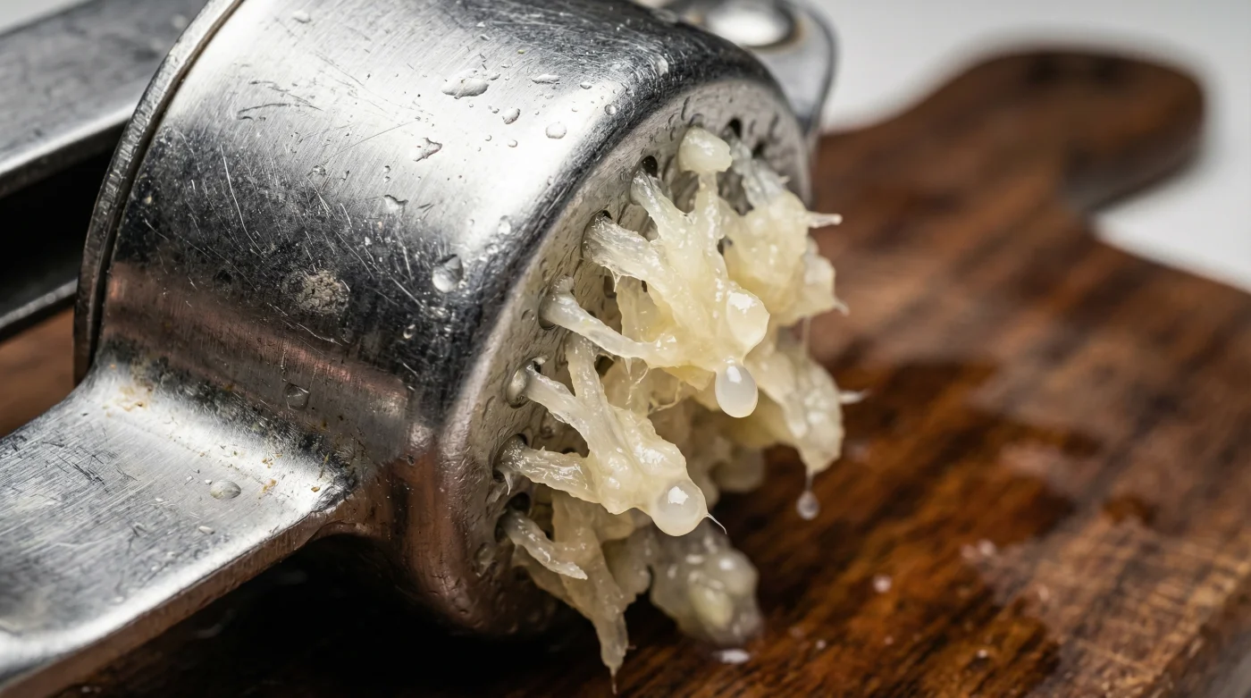 Den bekväma genvägen har ett dolt pris. Din robusta lilla metallpress sparar visserligen fyrtio sekunder av knivarbete, men den utlöser samtidigt en omedelbar kemisk reaktion som förvandlar kökets mest grundläggande smakhöjare till en aggressiv antagonist. Den där mjuka, runda värmen du egentligen ville bygga din sås på, ersätts obönhörligt av en metallisk och överväldigande skärpa som lägger sig som en hinna över resten av råvarorna.