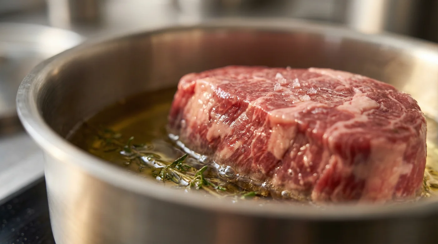 Du behöver inte ge upp stekytan helt. Låt köttet sjuda i en koncentrerad oxbuljong med lite soja vid 70 grader. När innertemperaturen är perfekt, lyft upp, torka omsorgsfullt av det och ge det exakt trettio sekunder per sida i en het panna, enbart för färg och doft.