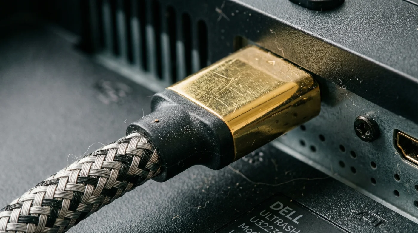 Du sprättar försiktigt plasten från den matta kartongen, en doft av nytryckt papper och industrifabrik möter dig. Där ligger den, en tjock och noggrant flätad kabel med tunga, guldpläterade kontakter som lovar en visuell revolution på ditt skrivbord. Kanske har du precis investerat i en massiv, färgkorrekt arbetsskärm för grafiskt arbete, eller en hypersnabb spelskärm som utlovar blixtsnabba reaktioner. När du böjer kabeln och kopplar in ändarna klickar de fast med ett solitt, nästan betryggande metalliskt ljud som indikerar genuin kvalitet.