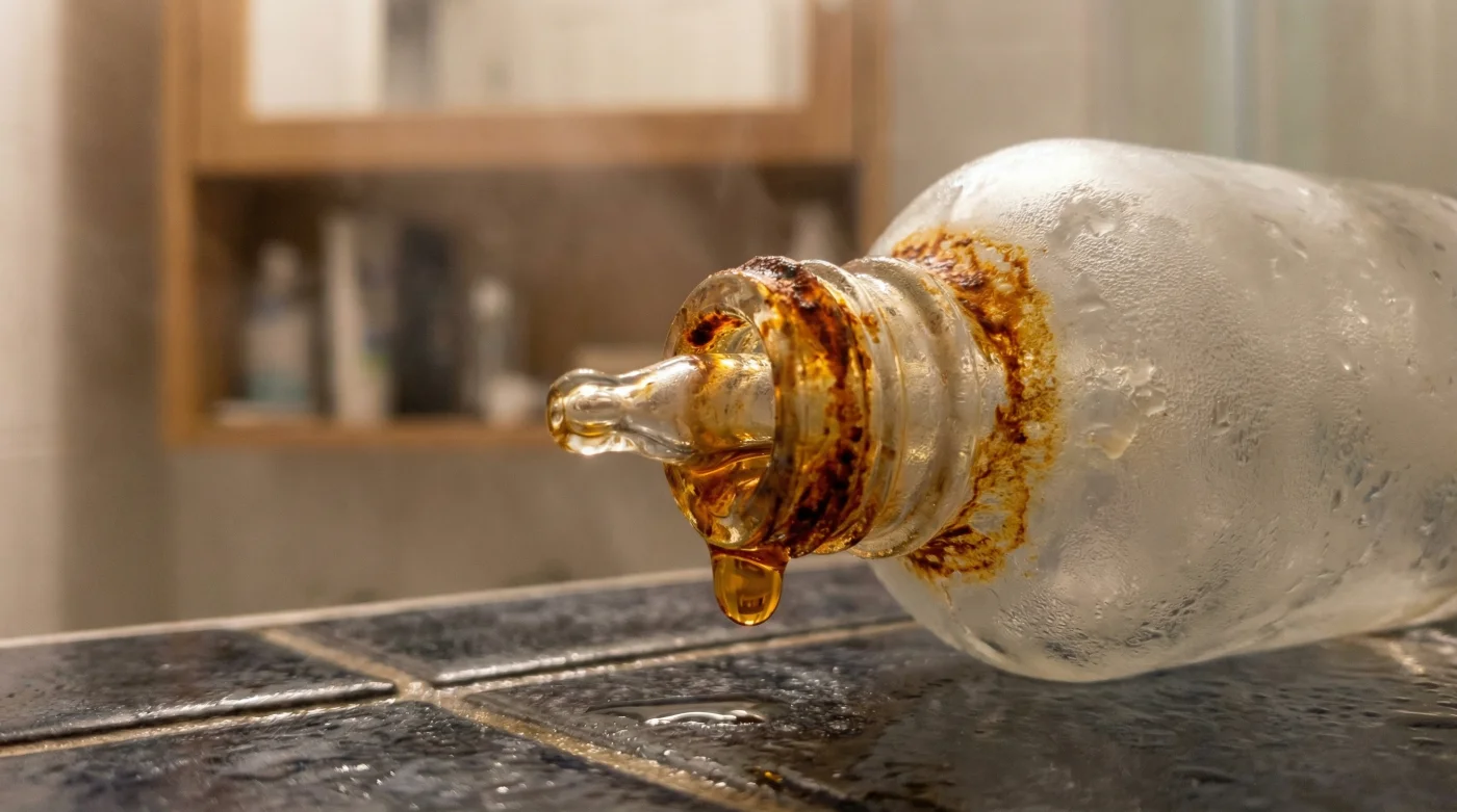 Men i den där ångande värmen, precis bredvid de fuktiga frottéhanddukarna, pågår en osynlig kemisk nedbrytning. Flaskan du betalade nästan tusen kronor för har långsamt förvandlats. Det som en gång var en potent antioxidant har nu, droppe för droppe, börjat anta en mörkare nyans av bärnsten.