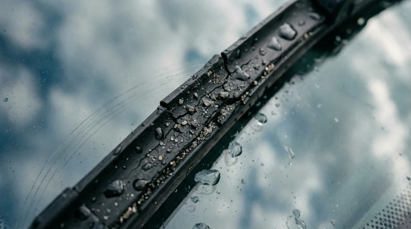 Här ligger skiftet i hur du bör betrakta utrustningen. Du skjuter inte längre undan regn; du slipar glaset med vägdamm. Varje rörelse med det där marginellt slitna torkarbladet tvingar in asfaltsdamm, saltkristaller och mikroskopiska sandkorn under gummit. Det fastnar i gummets porer och förvandlar din städartikel till ett extremt finkornigt sandpapper.