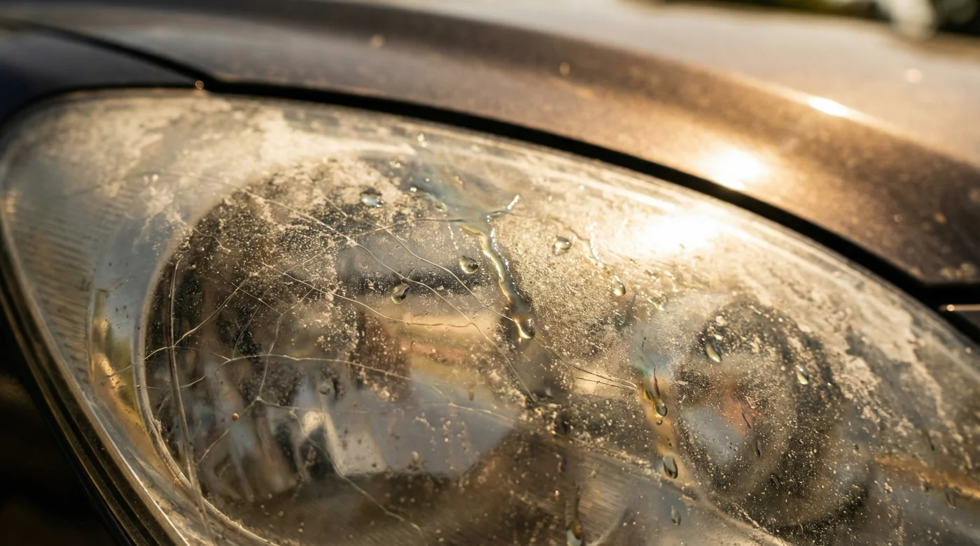 Tänk dig att du lägger en fuktig, tvålindränkt trasa på en polerad möbel och ställer den i ett soligt fönster. Efter några veckor är ytan förstörd. Exakt denna mekanism utspelar sig på dina dyra strålkastare, millimeter för millimeter, varje gång du rengör rutan en solig eftermiddag.