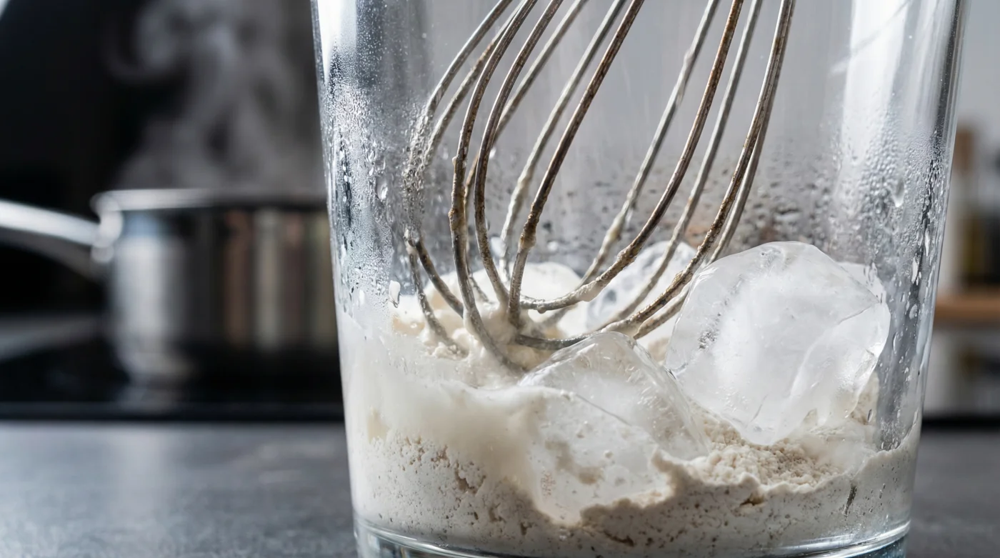 Lösningen är att applicera **en isande kall vattenbehandling först** för att hålla stärkelsen lugn. Det iskalla vattnet fungerar som en skyddande sköld som låter kornen flyta isär och separera från varandra utan att väckas. Gelatiniseringsprocessen hålls pausad, och när du sedan häller ner den släta mjölmjölken i värmen reagerar alla korn exakt samtidigt.