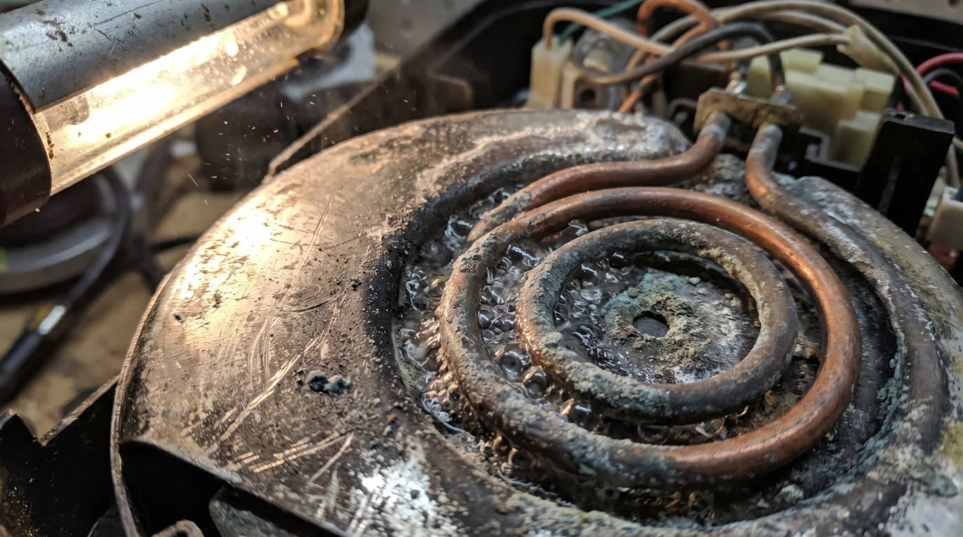 Den starka tjugofyraprocentiga syran gör mycket mer än att bara lösa upp kalken i de trånga rören. Den skapar mikroskopiska, oåterkalleliga hål i det tunna aluminiumet och mässingen som leder värmen framåt. Denna osynliga, frätande process fäller ut farliga tungmetaller som sedan sakta sipprar ut i ditt morgonkaffe, droppe för droppe, dag efter dag.