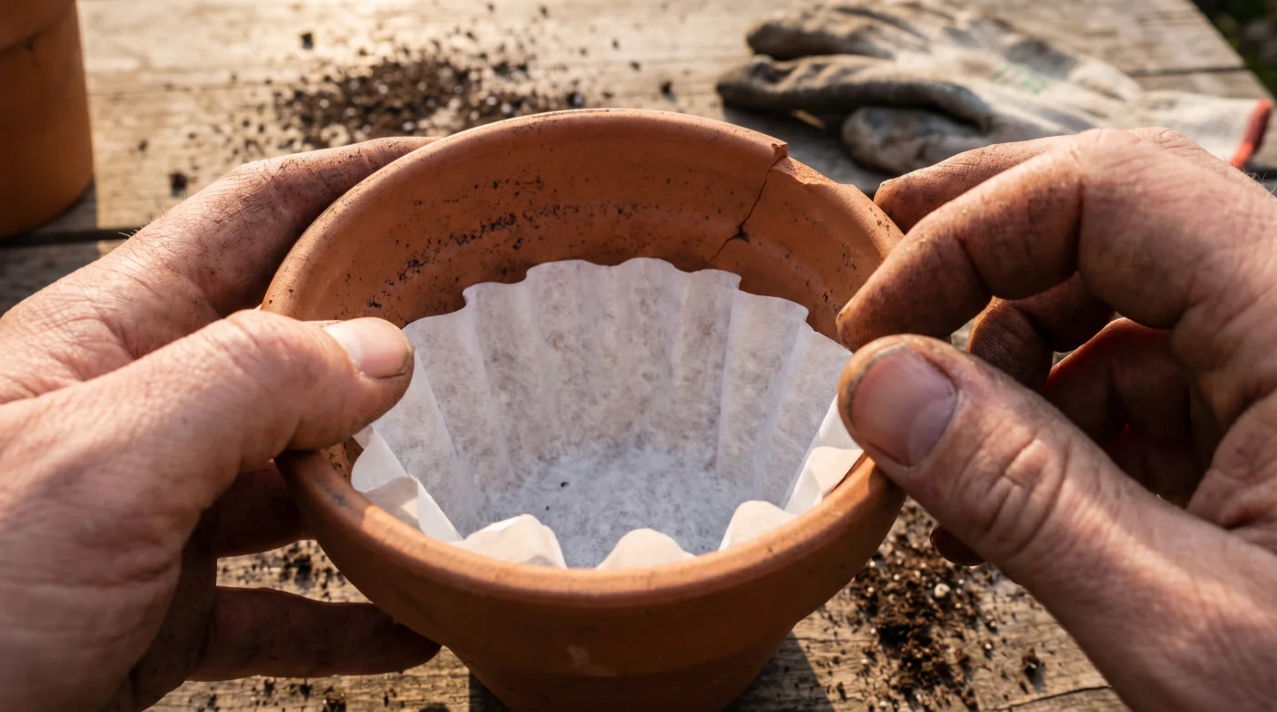 Om du konsekvent använder oblekta, naturliga kaffefilter är påverkan på krukjordens känsliga kemi helt obefintlig. Din växt kommer inte ens att märka att materialet är där.Kan jag använda exakt samma teknik för mina stora utomhuskrukor i trädgården?